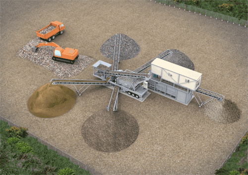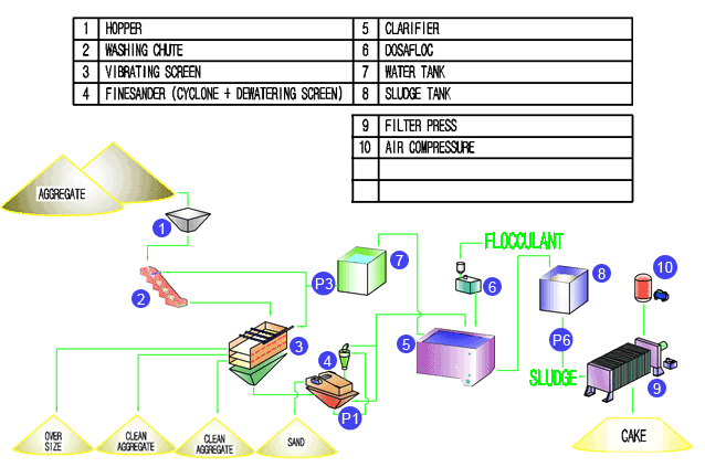 This facility consists of a washing line removing foreign matters and clay powder included in the aggregates through water washing; a sand line producing sands by processing the clay powder generated from the crushing line; and a water treatment line purifying slurry-included waste water generated from the sand line for reuse.