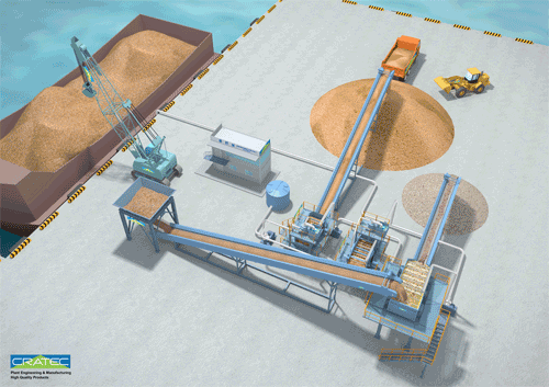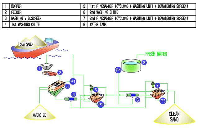 This facility consists of a washing line removing salt and clay powder included in the sea sands by washing them with water, and a separation line separating sands by their sizes.